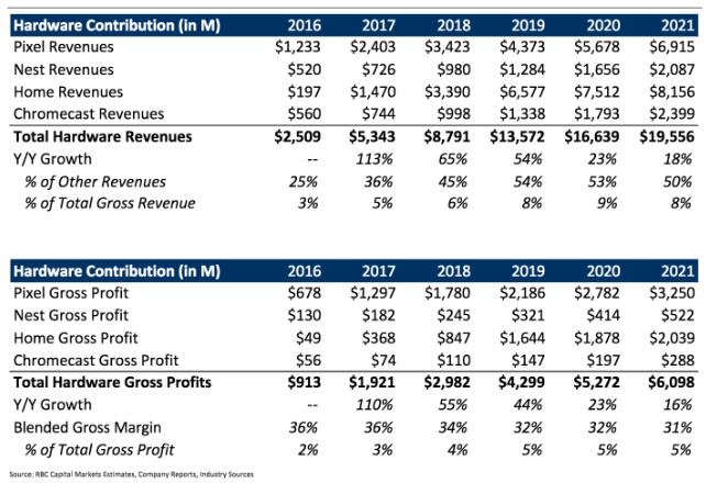 RBC表示谷歌最近的硬件成功,包括智能扬声器的日益普及以及其昂贵的Pixel手机的好评如潮,将带来收入和利润的增长。 RBC预计,到2018年,硬件部门将产生88亿美元(占总收入的6%)和30亿美元(或毛利润的4%)的总和。它说,到2021年,它将增加到196亿美元(占总收入的8%),利润为61亿美元(占利润的5%)。