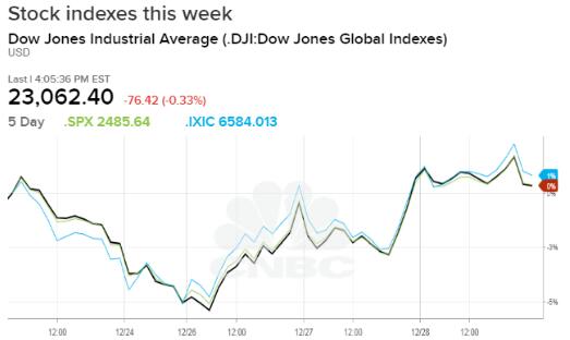 本周,主要平均指数均上涨至少2.75%,连续第四周上涨。 然而,股票仍然是自1931年以来最糟糕的12月表现。标准普尔500指数本月下跌9.9%,而道琼斯指数下跌9.7%。