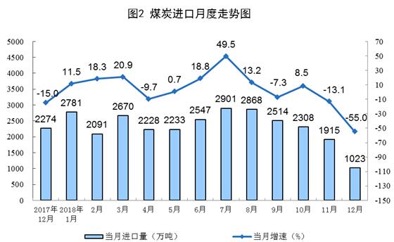 冬季供暖季以来,国内原煤产量稳定增长,市场供给较为充足。受此影响,12月份煤炭进口量大幅减少,仅进口1023万吨,为2014年6月份以来最低月进口量,同比下降55.0%。全年进口煤炭2.8亿吨,同比增长3.9%,比上年回落2.2个百分点。