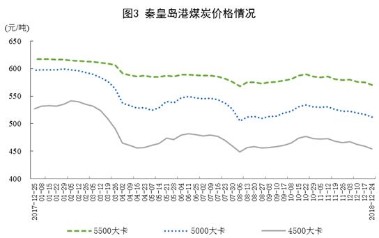 煤炭价格稳中有降。截至12月底,秦皇岛港5500大卡煤炭综合交易价格为每吨570元,比11月末下跌9元;5000大卡煤炭为每吨512元,下跌11元;4500大卡煤炭为每吨454元,下跌12元。