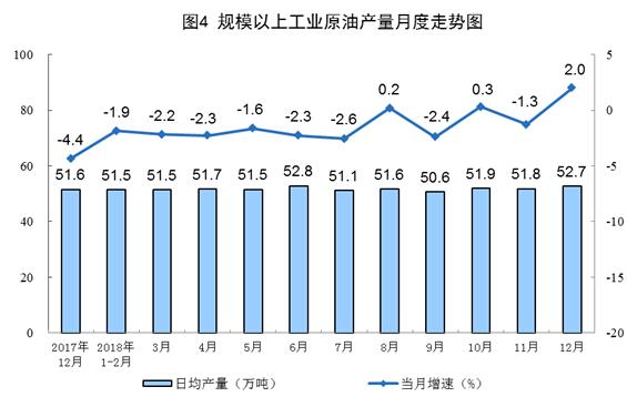 12月份,主要油田按计划增产,生产原油1633万吨,同比增长2.0%,增速由负转正,上月为下降1.3%;日均产量52.7万吨,环比增加0.9万吨。