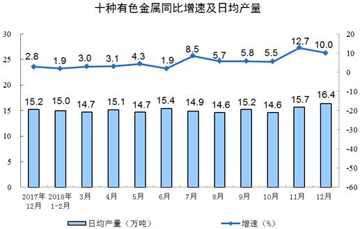 分行业看,12月份,41个大类行业中有37个行业增加值保持同比增长。其中,农副食品加工业增长5.9%,纺织业增长0.2%,化学原料和化学制品制造业增长1.8%,非金属矿物制品业增长8.8%,黑色金属冶炼和压延加工业增长9.2%,有色金属冶炼和压延加工业增长13.2%,通用设备制造业增长6.5%,专用设备制造业增长11.7%,汽车制造业下降4.1%,铁路、船舶、航空航天和其他运输设备制造业增长13.8%,电气机械和器材制造业增长10.1%,计算机、通信和其他电子设备制造业增长10.5%,电力、热力生产和供应业增长8.3%。