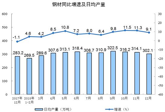 分产品看,12月份,596种产品中有330种产品同比增长。其中,钢材9365万吨,同比增长9.1%;水泥18394万吨,增长4.3%;十种有色金属508万吨,增长10.0%;乙烯160万吨,下降0.1%;汽车252.6万辆,下降14.9%,其中,轿车103.0万辆,下降17.1%;发电量6200亿千瓦时,增长6.2%;原油加工量5117万吨,增长4.4%。