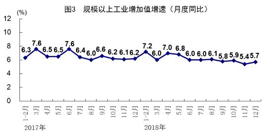 全年全国规模以上工业增加值比上年实际增长6.2%,增速缓中趋稳。分经济类型看,国有控股企业增加值增长6.2%,集体企业下降1.2%,股份制企业增长6.6%,外商及港澳台商投资企业增长4.8%。分三大门类看,采矿业增加值增长2.3%,制造业增长6.5%,电力、热力、燃气及水生产和供应业增长9.9%。高技术制造业、战略性新兴产业和装备制造业增加值分别比上年增长11.7%、8.9%和8.1%,增速分别比规模以上工业快5.5、2.7和1.9个百分点。新兴工业产品产量快速增长,铁路客车、微波终端机、新能源汽车、生物基化学纤维、智能电视、锂离子电池和集成电路分别增长183.0%、104.5%、40.1%、23.5%、18.7%、12.9%和9.7%。12月份,规模以上工业增加值同比增长5.7%,比上月加快0.3个百分点,环比增长0.54%。