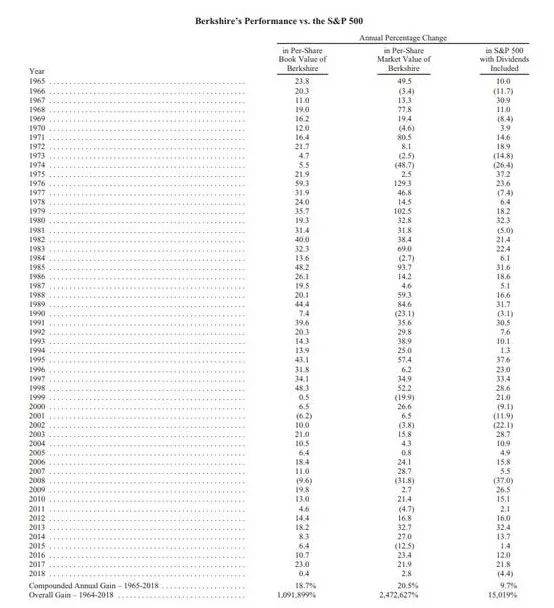 长期来看,1965-2018年,伯克希尔的复合年增长率为18.7%,明显超过标普500指数的9.7%。1964-2018年伯克希尔的整体增长率是1091899%(即10918倍以上),而标普500指数为15019%。