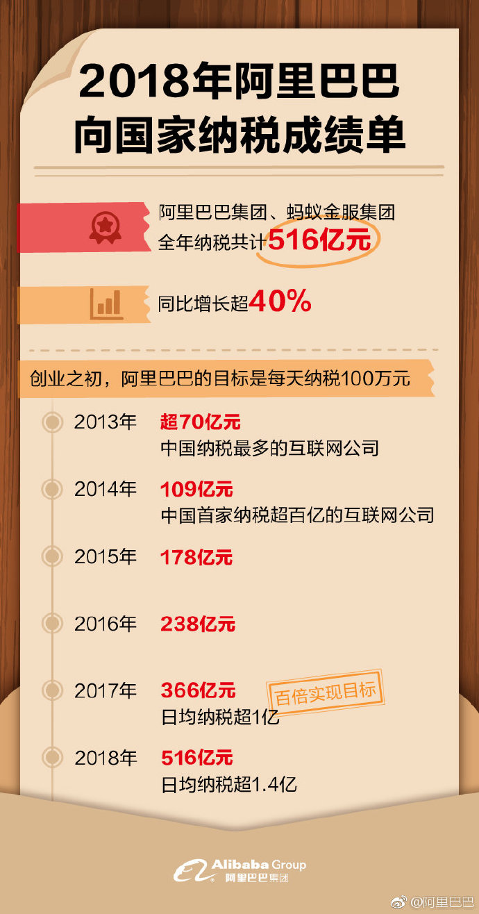 阿里巴巴集团和蚂蚁金服集团2018全年向国家纳税516亿元