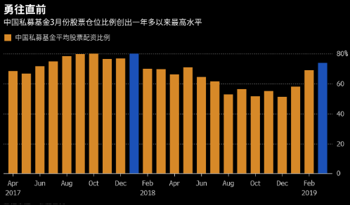 据跟踪100多家私募基金动态的华润信托发布的数据,中国的私募基金经理们3月份加大了对股票的配资,平均股票仓位比例增加到了74%。这也是其股票仓位比例连续第三个月上升,同时也创出了2018年1月份以来的最高水平。中国股市开年以来涨势凶猛,上证综指年内迄今涨幅已经达到30%,在世界主要股指中表现名列榜首。