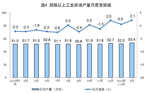 3月份,生产原油1654万吨,同比增长2.1%,增速比1—2月份加快1.6个百分点;日均产量53.4万吨,比1—2月份日均增加1.4万吨。1季度,生产原油4735万吨,同比增长0.6%,去年同期下降2.0%,增速由负转正。