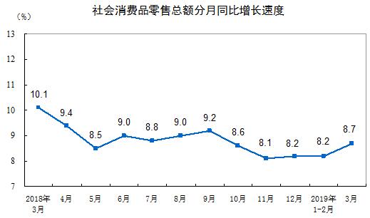 2019年一季度,社会消费品零售总额97790亿元,同比名义增长8.3%(扣除价格因素实际增长6.9%,以下除特殊说明外均为名义增长)。其中,3月份社会消费品零售总额31726亿元,同比增长8.7%。