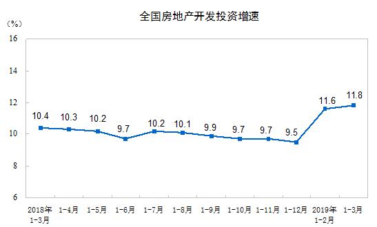 2019年1-3月份,全国房地产开发投资23803亿元,同比增长11.8%,增速比1-2月份提高0.2个百分点。其中,住宅投资17256亿元,增长17.3%,增速回落0.7个百分点。住宅投资占房地产开发投资的比重为72.5%。