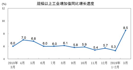 2019年3月份规模以上工业增加值增长8.5% 比1-2月份加快3.2个百分点