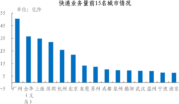 快递业务量排名前十五位的城市依次是广州、金华(义乌)、上海、深圳、杭州、北京、东莞、苏州、成都、泉州、揭阳、武汉、温州、宁波和南京,其快递业务量合计占全部快递业务量的比重达到57.5%。