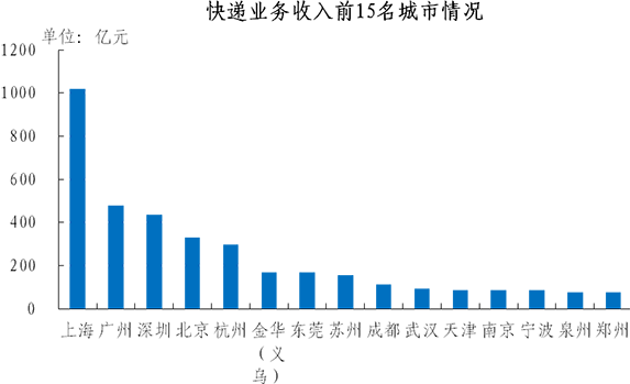 快递业务收入排名前十五位的城市依次是上海、广州、深圳、北京、杭州、金华(义乌)、东莞、苏州、成都、武汉、天津、南京、宁波、泉州、郑州,其快递业务收入合计占全部快递业务收入的比重达到60.8%。