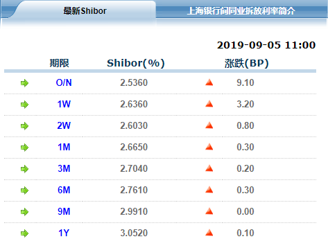 隔夜Shibor报2.5360%,上涨9.10个基点;7天Shibor报2.6360%,上涨3.20个基点;3个月Shibor报2.7040%,上涨0.20个基点。