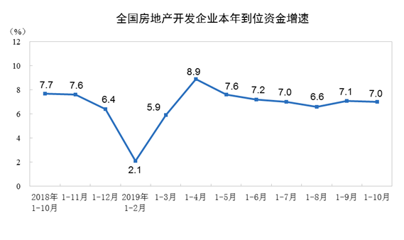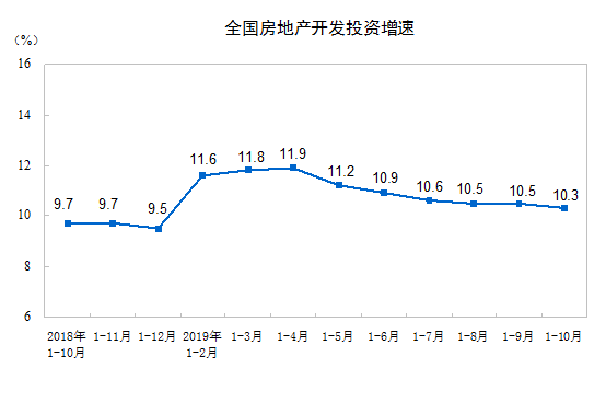 2019年1—10月份,全国房地产开发投资109603亿元,同比增长10.3%,增速比1—9月份回落0.2个百分点。其中,住宅投资80666亿元,增长14.6%,增速回落0.3个百分点。