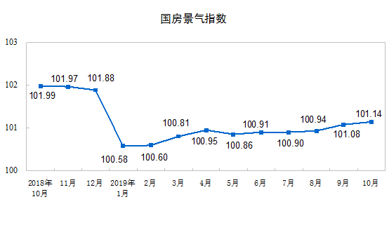 10月份,房地产开发景气指数(简称“国房景气指数”)为101.14,比9月份提高0.06点。