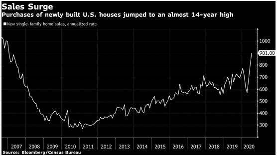 美国7月新建住宅销售窜升至近14年来最高水平,因抵押贷款利率降至低位,帮助推动了市郊建筑开工活动。周二公布的政府数据显示,新建住宅折合年率销量环比增长13.9%,达到90.1万套。彭博调查经济学家预估中值为79万套。售价中值同比上涨7.2%,至330,600美元。