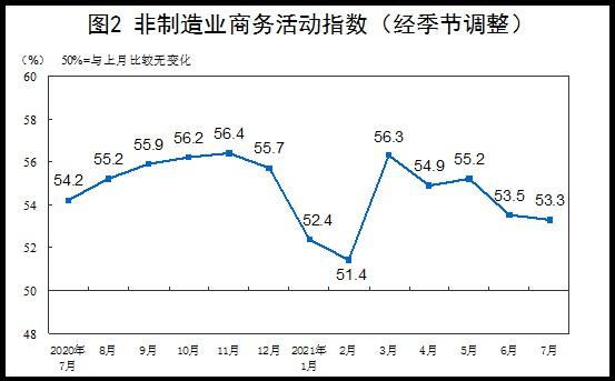 7月份,非制造业商务活动指数为53.3%,略低于上月0.2个百分点,继续高于临界点,表明非制造业总体保持平稳扩张。