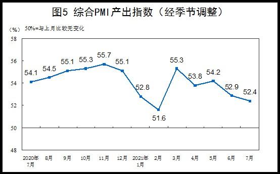 7月份,综合PMI产出指数为52.4%,比上月回落0.5个百分点,表明我国企业生产经营活动扩张速度有所放慢。
