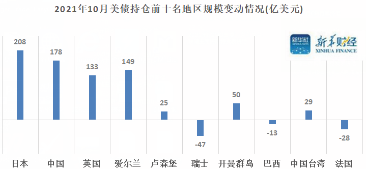 此外,10月持仓数据显示,爱尔兰和卢森堡排位再次对调,爱尔兰升回第四位,该国当月大举增持149亿美元,仓位至3243亿美元,而卢森堡增仓规模仅25亿美元。当月减仓28亿美元,排名滑落至第十位。