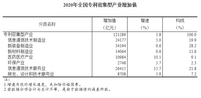 统计局:2020年全国专利密集型产业增加值占GDP比重11.97%
