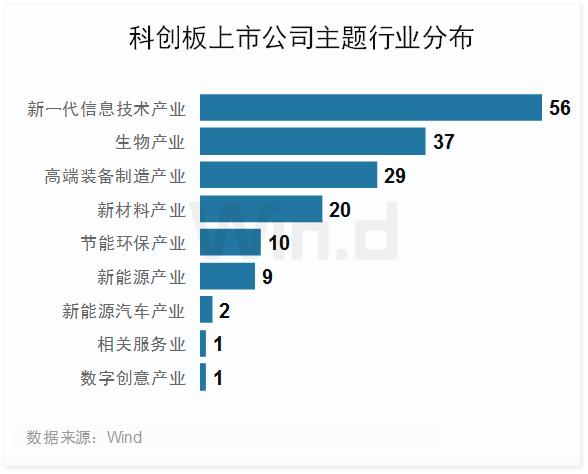 2021年,科创板硬科技阵营壮大至370余家,成为A股重要组成部分。全年科创板共有165家成功IPO,较2020年上市145家小幅增长13.79%;公司主要分布在9个Wind科创主题行业中,其中新一代信息技术产业有56家挂牌遥遥领先,生物产业、高端装备制造产业的挂牌数紧随其后,分别达37家、29家,体现出对这些“硬科技”产业的坚定支持。