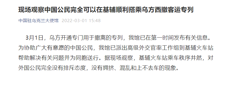 中国驻乌克兰大使馆工作人员在现场观察到,基辅火车站乘车秩序井然,对外国公民完全没有排斥态度,没有拥挤、混乱和上不去车的现象。中国公民完全可以在基辅顺利搭乘乌方西撤客运专列。