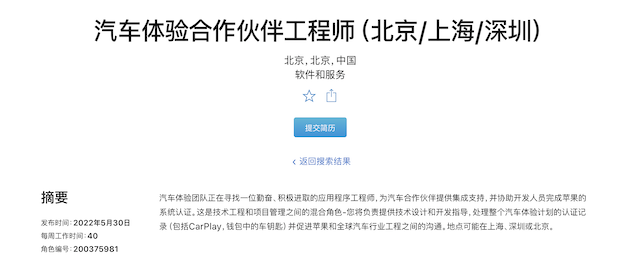苹果官网信息显示,近期苹果正在北京、上海、深圳三地招聘汽车体验合作伙伴工程师。根据其职位描述,该岗位需要为汽车合作伙伴提供集成支持,并协助开发人员完成苹果的系统认证。