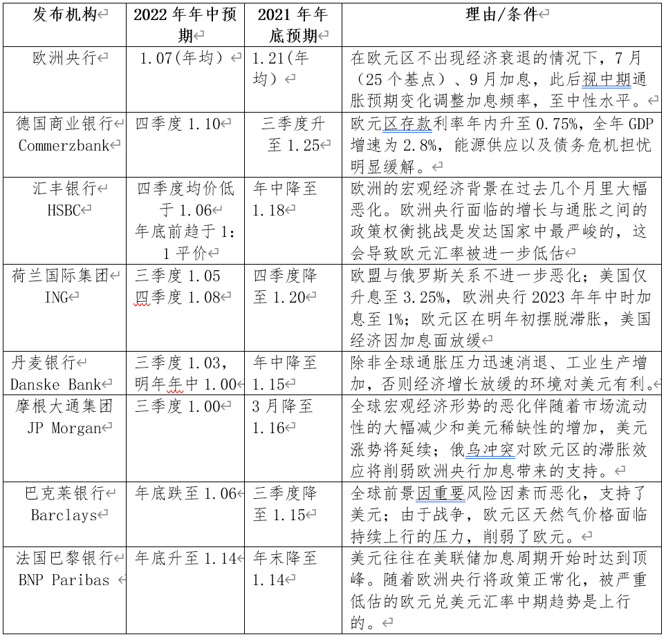 表:部分机构对2022年下半年欧元兑美元汇率走势预测 来源:新华财经调查整理