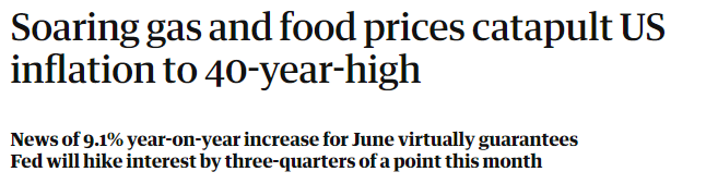 中国日报网7月15日电 英国《卫报》网站7月13日报道称,美国6月份通货膨胀增速超出预期,主要受汽油、食品和住房价格上涨影响,通胀率出现40多年来最大的年度增幅。这一消息也基本确定,美联储(Federal Reserve)将在本月再次加息75个基点。