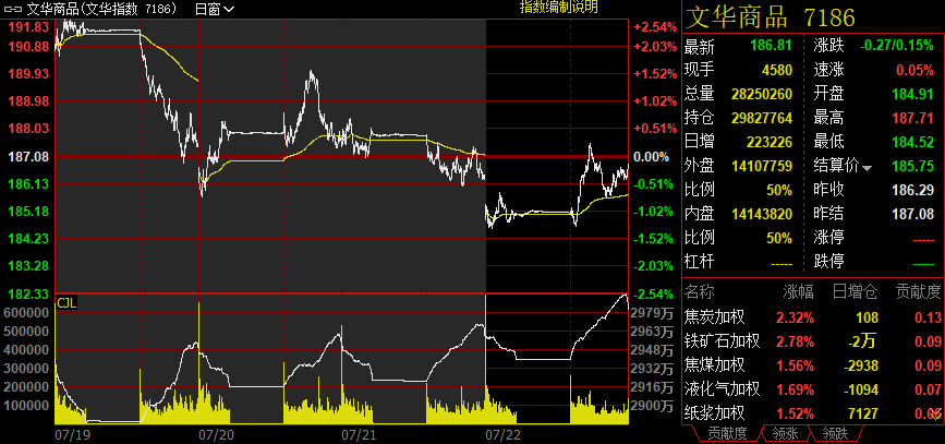 新华财经北京7月22日电(郭洲洋、张瑶)7月22日国内商品市场涨跌互现,截至下午收盘,追踪国内商品市场的综合指数收报186.81点,较上一交易日下跌0.27点,跌幅0.15%。上涨品种中,铁矿石主力合约涨超3%;棉花、焦炭、纸浆、PVC、纯碱,焦煤、液化气主力合约涨超2%。下跌品种方面,棕榈油、玻璃、菜粕、乙二醇(EG)、苯乙烯主力合约跌超2%。