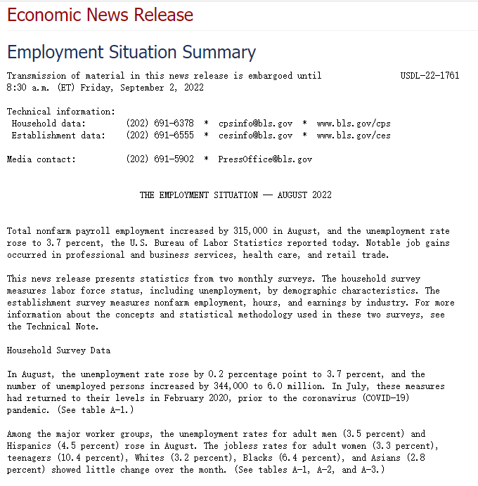 另有市场分析指出,经过美联储的加息风暴洗礼,美国通胀水平虽然依然在40年高位附近徘徊,但美国7月CPI、核心CPI增速双双回落,预示着美国经济正在降温。更重要的是,有着“小非农”之称的ADP新增就业人数远低于预期,多数华尔街投行认为,8月劳动力市场大幅降温。