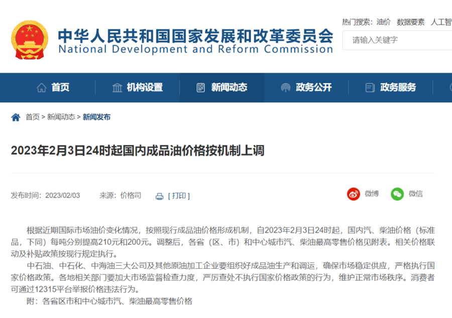 根据近期国际市场油价变化情况,按照现行成品油价格形成机制,自2023年2月3日24时起,国内汽、柴油价格(标准品,下同)每吨分别提高210元和200元。调整后,各省(区、市)和中心城市汽、柴油最高零售价格见附表。相关价格联动及补贴政策按现行规定执行。