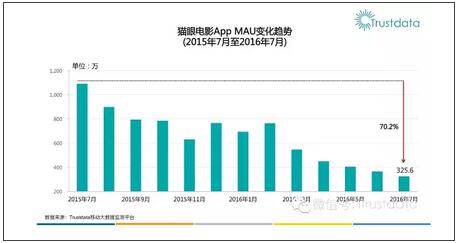 而根据Trustdata信诺大数据的报告显示,猫眼App的月活也从2015年7月超千万的峰值,直线下降到2016年7月的300万多一点,同比下降超过70%。猫眼“票补换市场”的策略正式宣告失败,急需寻找其他途径来稳固自己的用户量。