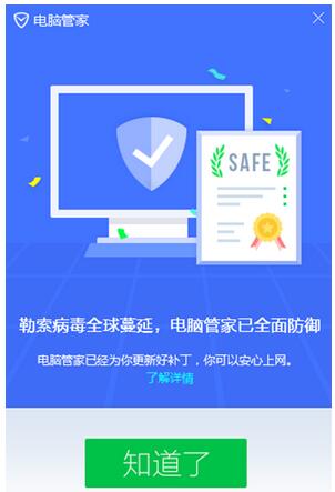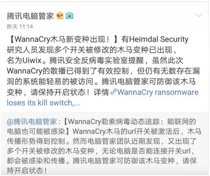 腾讯电脑管家安全专家王宇表示,目前腾讯电脑管家已经可以防御该病毒变种,腾讯电脑管家昨天就已经向用户发送了安全提醒,提示用户安装使用腾讯电脑管家,及时更新修补系统补丁可以防御,用户不必担心。据腾讯电脑管家监控发现,在国内已经有用户中招。