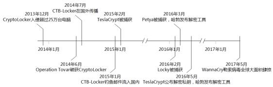 CryptoLocker就算不是最早的勒索病毒,也是较早引起人们关注的勒索病毒之一了。早在2013年,就有报道称其已经入侵了超过25万台电脑。很快,在2014年,由美国司法部、FBI等部门联合发起的国际执法安全行动Operation Tovar(有媒体音译为托瓦尔行动)中,此木马及其传播工具被破获,并且有安全公司拿到了部分解密密钥,为此前已经被加密的受害者提供文件解密服务。然而这次行动并未成为勒索病毒覆灭的丧钟,相反却是今后此类木马愈演愈烈的起点。
