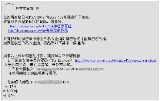 某版本Locky木马敲诈说明,在中文Windows下会显示繁体中文内容
