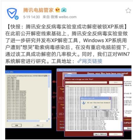 WannaCry勒索病毒阻击战取得新突破,被锁用户有望实现解密。腾讯安全反毒实验室通过官方微博发布,在此前公开解密线索基础上,腾讯安全反病毒实验室做了进一步研究并发布XP解密工具(工具地址:https://habo.qq.com/tool/download/searchdky),Windows XP 系统用户遭到“想哭”勒索病毒感染后,在没有重启电脑的前提下,通过该工具可以大概率成功解密,解密恢复成功率是其他文件恢复工具的几倍。同时,腾讯安全反病毒实验室表示正在对影响更大的WIN7系统解密进行研究。
