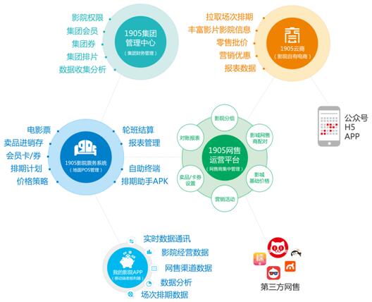 “1905影院票务系统”于2014年9月正式获得牌照,并推出了“1905影院票务系统”、“1905集团中心”、“1905网售运营平台”、“1905云商”,以及移动端应用“我的影院”五大优质产品。1905票务团队基于10年互联网运营和电影行业的经验积淀,通过深入影院、院线及网售商实地调研等方式,从三方实际业务需求出发,为影院打通上下游产业链以应对复杂多变的市场策略而特别设计的产品。
