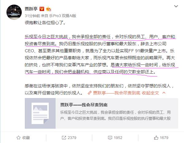 贾跃亭公开信:我会尽责到底,把欠款全部还上