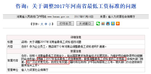 网友咨询河南省2017年最低工资标准的调整方案。图片来自河南省政府网站。