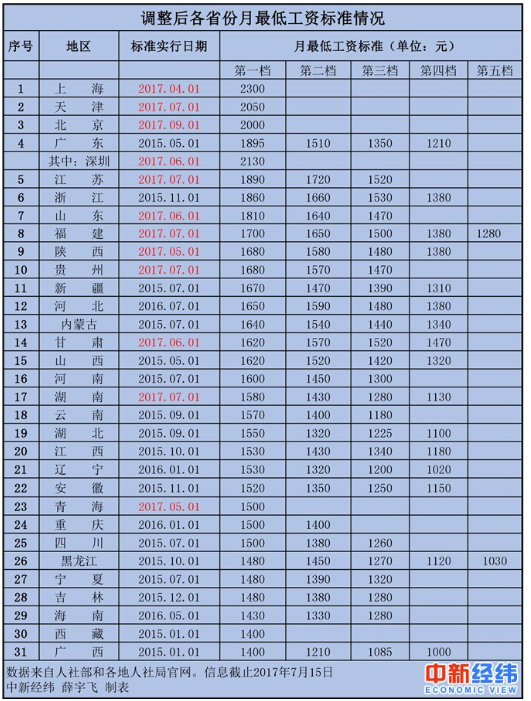 中新经纬7月16日电(薛宇飞) 2017年已经过半,全国多个省市已经上调了今年的最低工资标准。中新经纬客户端统计发现,截止7月15日,上海、天津、江苏、山东等11个省市及深圳上调了最低工资标准,其中,北京将在今年9月调整到位。数据显示,地方政府上调最低工资的步伐有所放慢,涨幅已经出现回落。