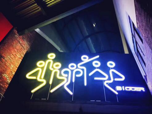 由两栋砖墙之间的通道改造成的主入口上方,出现了由LED灯组组成的一系列有趣人物造型,看上去似乎在开会讨论。据了解,该墙壁后方正是一间会议室。夜幕降临,灯组色彩闪烁,恰似一组新媒体当代艺术装置,给老厂房增添了几分艺术调性。