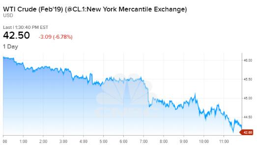 随着股市下滑,美国原油价格暴跌6.7%,收于18个月低点42.53美元